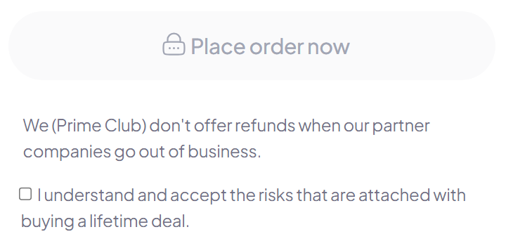 Before Checkout Completion: Prior to completing any purchase, users are presented with an explicit acknowledgment screen requiring them to check a box confirming they understand that Prime Club cannot guarantee continued access if a partner company discontinues its product
